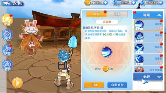 为主动技能和辅助技能,主动技能多为直接发动对目标造成伤害,辅助技能为提供buff。玩家可以对技能进行升级但是不能超过角色等级,升级技能需要消耗金币和相应的技能升级卷,升级技能可以增加技能效果,技能飞升也是提升技能效果的好办法,但需要消耗飞升卷轴,飞升满级为4级。