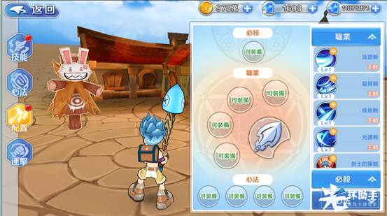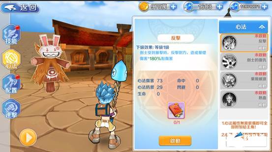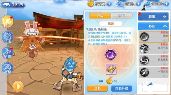 必杀和心法都需要对应的道具启动,技能通过玩家等级提升自动开启