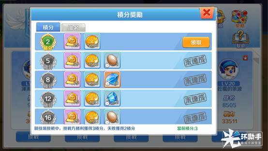 战斗胜利后玩家会代替击败玩家的排名,并且获得绑钻和金币的奖励。玩家挑战胜利会获得3积分,失败获得2积分,积分在“奖励”中可以领取相应积分的奖励。