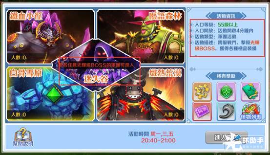 活动开始后4分钟内可以自由进入无限制,4分钟后关闭入口,只有击杀了光辉boss的军团可以进入击杀boss后出现的传送阵进入迷失0谷。活动内boss区域可以自由pk抢夺怪物(跨服地图击杀玩家不计红名值)。在击杀boss后,所属军团成员群可以采集boss宝箱,击杀了光辉boss,所属军团成员可获得专属奖励。