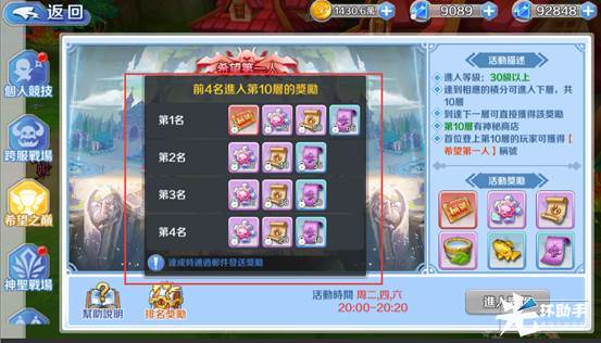 希望之巅一共分为10层,每个玩家要达到相应的积分就可以直接进入下一层,在活动中击杀玩家霍德尔2积分,击杀怪物1积分,而且只有给予最后一击的才算击杀哦!玩家到达下一层后可直接获得该层的奖励。在最后一层会有神秘的商人出售超级特惠物品!第一个登上10层的玩家还会额外获得【希望第一人】的称号哦!