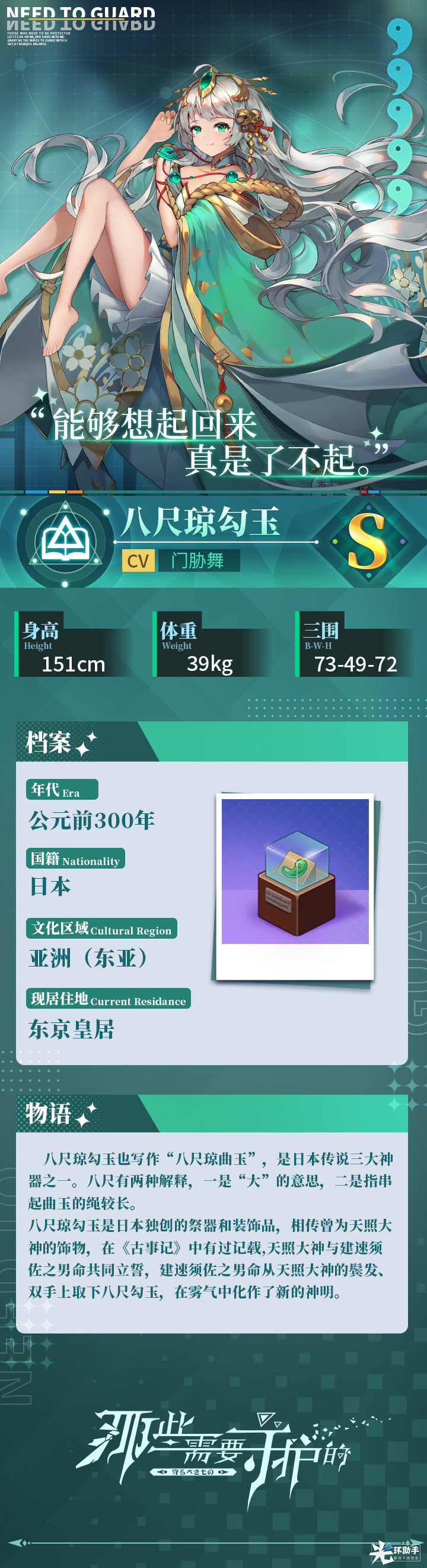 八尺琼勾玉是日本独创的祭器和装饰品,相传曾为天照大神的饰物,在《古事记》中有过记载,天照大神与建速须佐之男命共同立誓,建速须佐之男命从天照大神的鬓发、双手上取下八尺勾玉,在雾气中化作了新的神明。