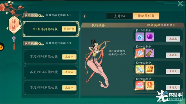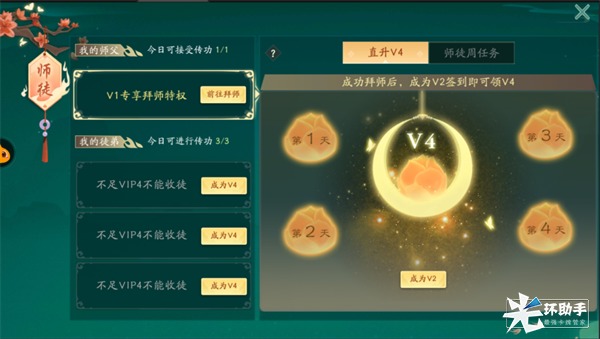 徒弟奖励:V1玩家可以进行拜师,但无法领取V4成为V2之后才可以进行签到领V4。V2玩家成为徒弟后,连续登录4天后,即可激活V4,达到V4后还可以收其他玩家为徒哦。