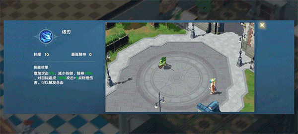 诸刃:牺牲防御和精神力,提高攻击力;由于牺牲的防御力和精神力在行动开始时就生效,所以技能技巧:适合出手速度快的单位在一动时使用,出手后负面状态消失。