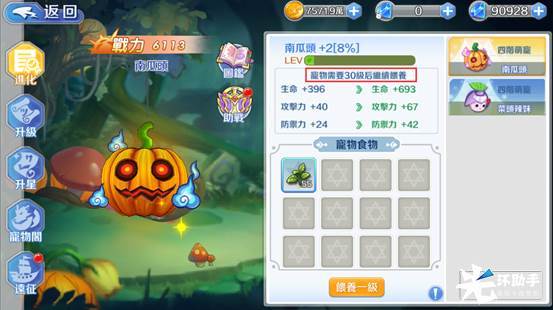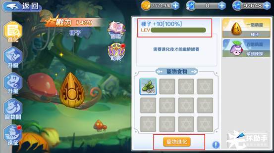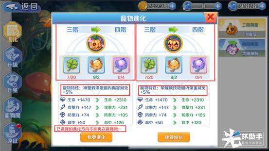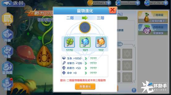 宠物可以通过喂食的方式进化,当达到+10时玩家可以对宠物进行进化,进化消耗宠物进化的道具,宠物进化后会大幅的增加属性,同时形态也会改变。