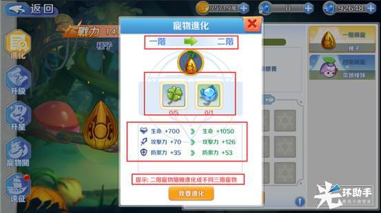 当玩家有足够的对应宠物的碎片时也可以对宠物进行升星,升星可以提高宠物属性,达到两星后玩家还需要使用对应宠物的“系”升星碎片和宠物碎片进行升星