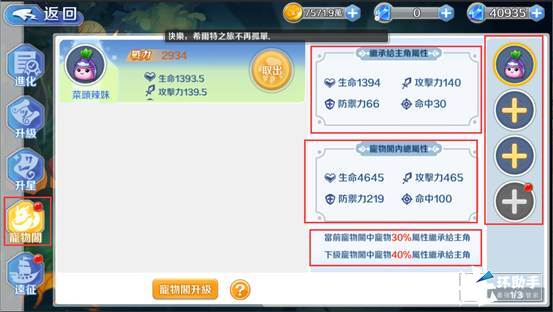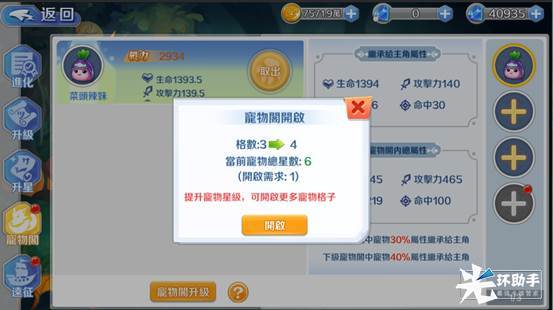 玩家可以通过宠物阁功能将闲置的宠物放在里面将宠物的部分属性继承给玩家角色,提升宠物的星级,可以开启更多的宠物格子