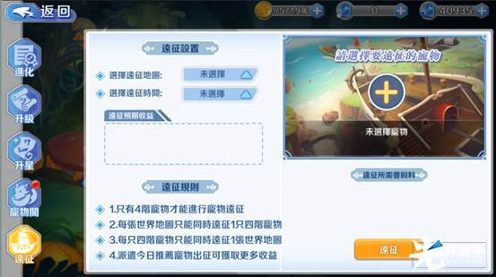 玩家可以让自己的宠物进行远征,需要选择地图和远征时间,时间越长收益越好,使用推荐的宠物收益提升20%,只有4阶的宠物才可以远征,每张地图只能同时远征一只4阶宠物,每只4阶宠物只能远征一张世界地图。派遣需要消耗饲料金币等道具。