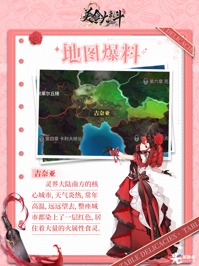 《美食大乱斗》地图爆料 | 南方核心-吉奈亚bzs发布于 2022-08-10【背景】: 吉奈亚,灵界大陆南方的核心城市,天气炎热,常年高温,远远望去,整座城市都染上了一层红色,居住着大量的火属性食灵。