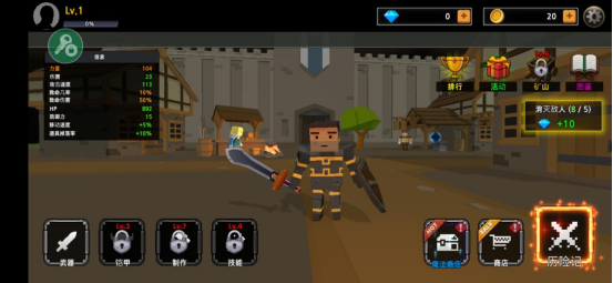 游戏以像素风格为画面渲染,在画面呈现上以方块状的角色造型为基本设定,所以在整体的画面呈现上,基本都是一些方块状的道具造型,不管是在敌人造型角色还是在其他道具上,都是一样的,而这样的设计还是能引起我小时候玩到的手游回忆,而在具体操作中,玩家需要去进行操作角色击败所有的敌人才能通关,基于游戏是以关卡为节点进行整体推进的,不能通关的话就不能进入下一关,不过好在游戏的难度并不是很大,敌人的血量也不是很高,也有可能是前期的难度较低哈,后期可能会比较高一些,不过对于游戏操作来说,给到玩家的体验感还是比较流畅的,并没有因为方块状的设计而僵硬化,这一点还是值得肯定的。