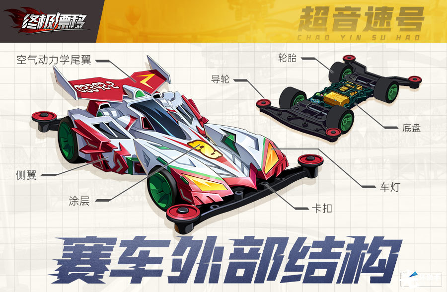 想要心仪的爱车在赛场上将性能发挥到极致,那么必须先要了解赛车的结构,学习熟悉了整个结构,才方便我们去对它进行组装改造。为了能让大家阅读得更加清晰明了,夏日连夜绘制了一幅赛车的外部结构示意图——