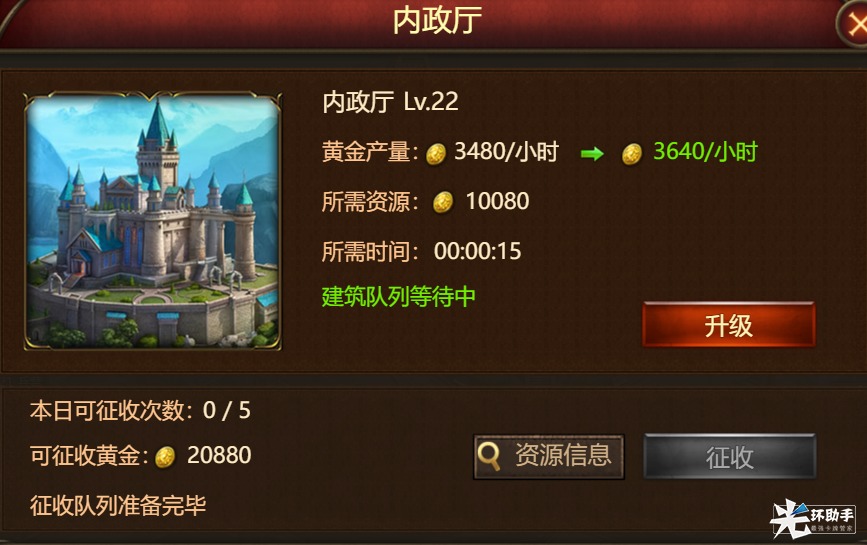 首先是各位领主的内政厅。内政厅的等级决定了其他建筑的上限,所以领主们在升级后的第一件事应该就是升级该建筑。在内政厅中,领主可以定时征收黄金,一天可以征收5次,数量相当可观。