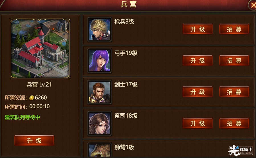 左下角的兵营,升级后可以提升士兵的等级。在兵营到达一定等级后,还可以解锁更强力的兵种。