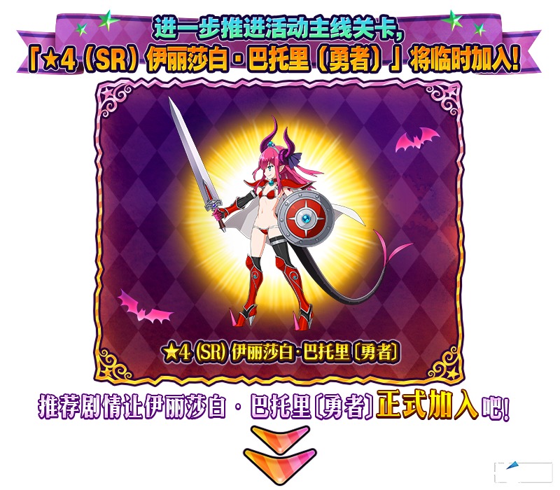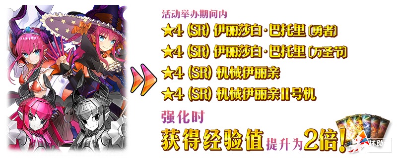 在以下时间段内,「★4(SR)伊丽莎白·巴托里〔万圣节〕」「★4(SR)伊丽莎白·巴托里〔勇者〕」「★4(SR)机械伊丽亲」「★4(SR)机械伊丽亲Ⅱ号机」强化时获得的经验值将提升为2倍。