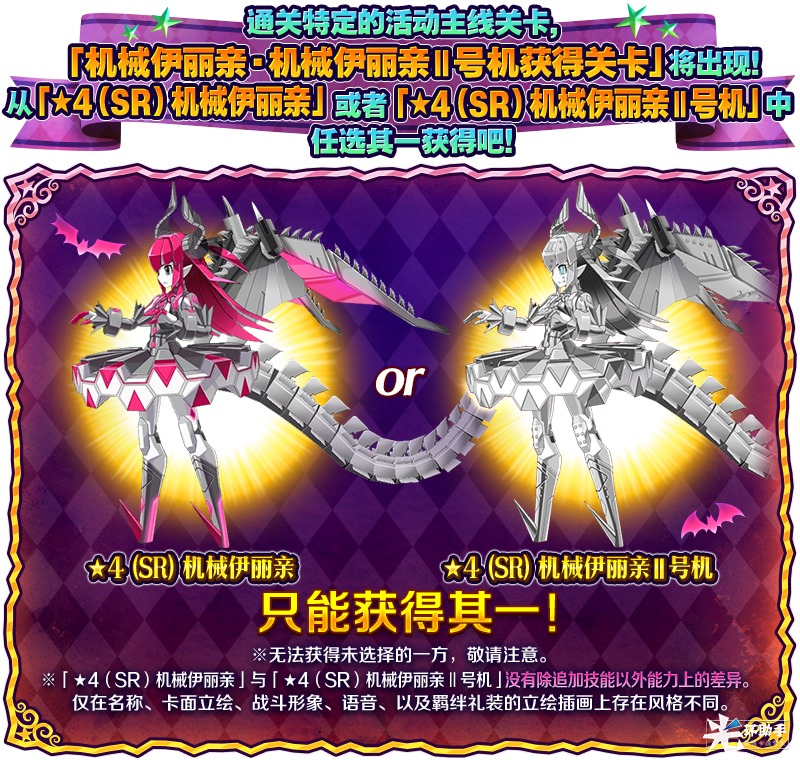 此外,推进活动主线关卡活动限定从者「★4(SR)伊丽莎白·巴托里〔万圣节〕」和「★4(SR)伊丽莎白·巴托里〔勇者〕」将正式加入之外,通关特定的活动主线关卡之后将开放『【只能二选其一!】「机械伊丽亲」获得关卡』和『【只能二选其一!】「机械伊丽亲Ⅱ号机」获得关卡』,选择其一通关可获得活动限