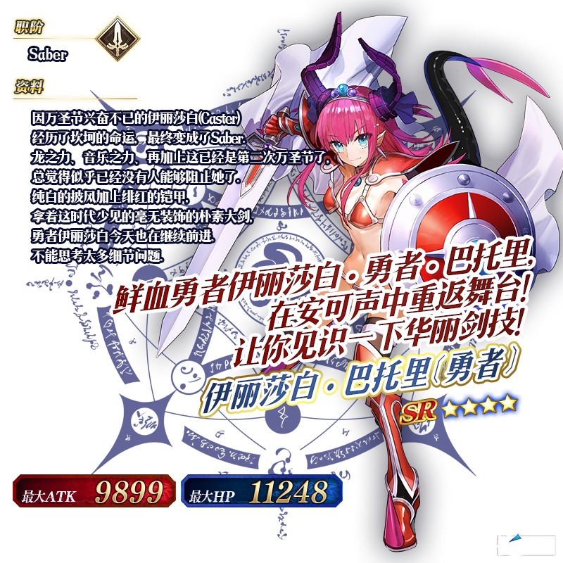 ※「★4(SR)伊丽莎白·巴托里〔万圣节〕」「★4(SR)伊丽莎白·巴托里〔勇者〕」「★4(SR)机械伊丽亲」「★4(SR)机械伊丽亲Ⅱ号机」完成灵基再临时不会有战斗形象的变化,敬请注意。