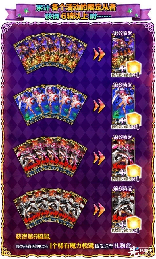 各活动限定从者获得6骑起,每新获得1骑便会有1个稀有魔力棱镜被发送至礼物盒。