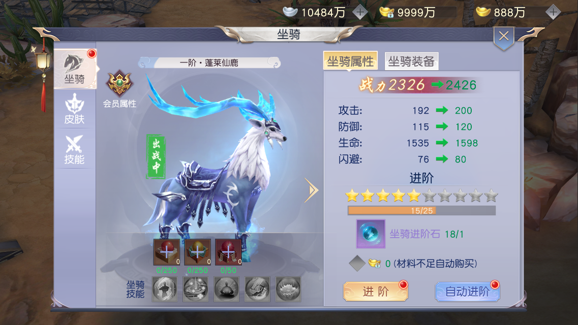 1)坐骑用于角色在场景中骑乘,让角色能以更快的速度移动。包含坐骑属性(装备、被动技能)、坐骑进阶、坐骑皮肤和属性丹功能。在主界面右下角点击坐骑按钮