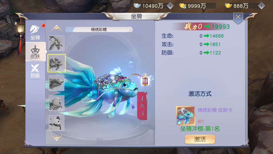 7)在坐骑皮肤界面,通过消耗对应坐骑皮肤卡,可以激活额外的坐骑外观。已激活的皮肤除了和默认坐骑外观一样可幻化外,还能为角色增加额外的属性。