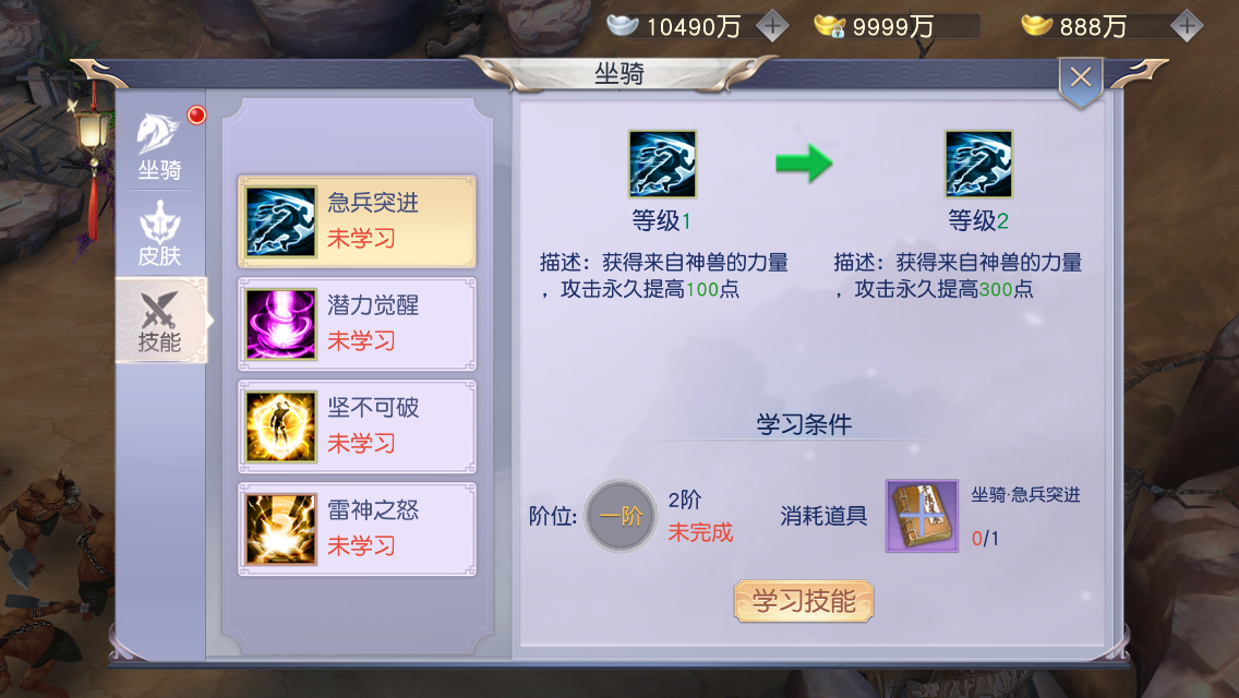 5)坐骑技能分2种,达到固定等阶自动习得的被动技能,和使用技能书手动学习的技能。
