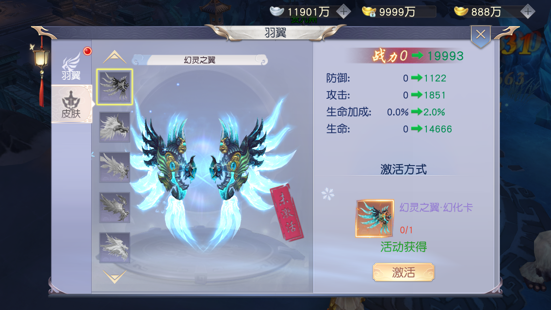 6)在羽翼皮肤界面,通过消耗对应羽翼皮肤卡,可以激活额外的羽翼外观。已激活的皮肤除了和默认羽翼外观一样可幻化外,还能为角色增加额外的属性。