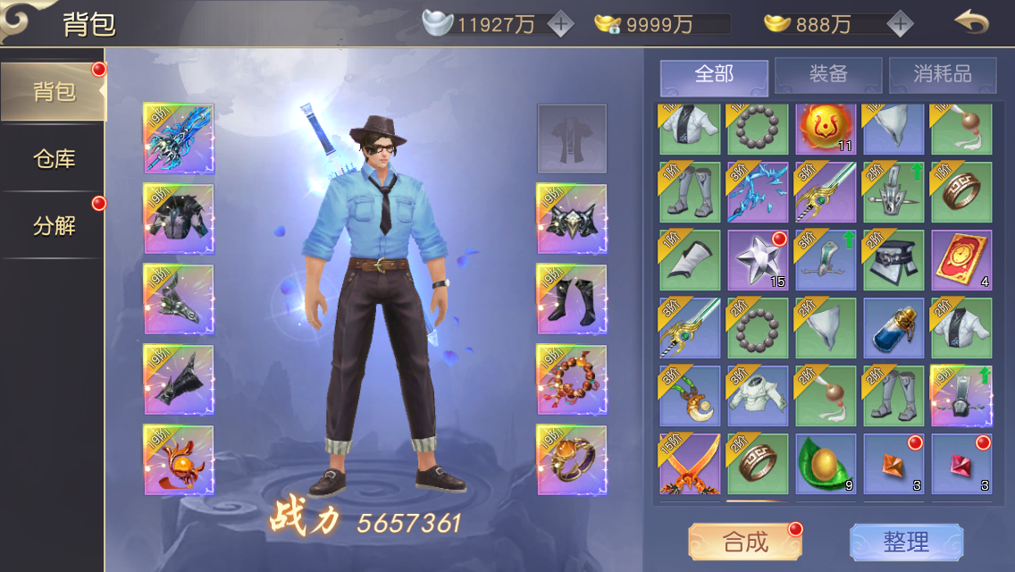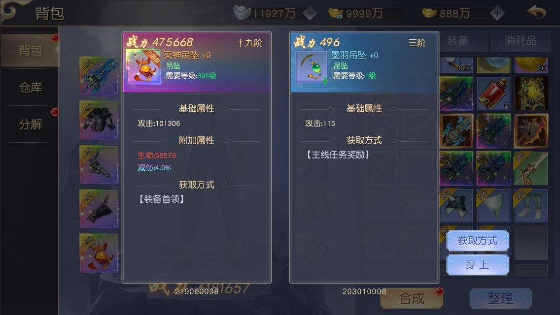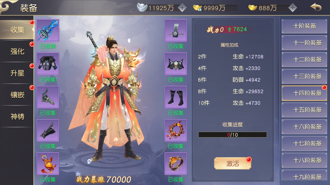 2)套装激活:通过消耗对应的套装石,能为装备激活,增加属性,在激活满指定5件和10件时,能激活套装效果,获得更高的属性加成和被动技能。套装有2套,弑神套和诛仙套,消耗不同的套装石。