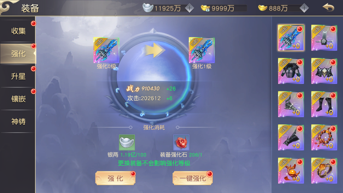 4)装备强化:消耗银两和装备强化石,可提升装备强化等级。强化后,将给装备属性少量提升。装备强化等级不可超过角色等级。可使用一键强化功能,将全身装备强化一次。