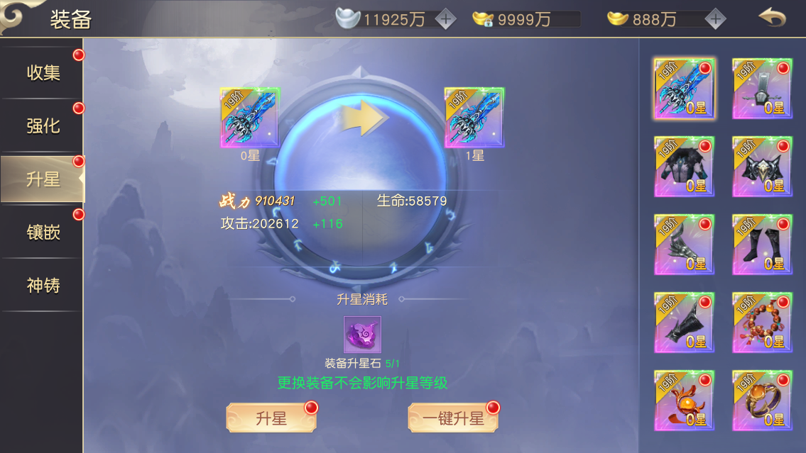 5)装备升星:消耗装备升星石,可提升装备星级。升星后将给装备属性大量提升。装备星级上限受装备阶数限制,越高阶的装备,星级上限越高。