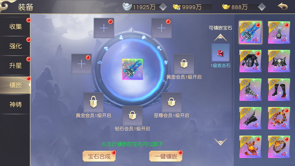 初始每个装备拥有2个镶嵌孔,第3个镶嵌孔在达到指定角色等级后解锁,其余4个在达到指定会员类型和等级后解锁。可以通过一键镶嵌,为所有装备的镶嵌或更换背包中最高级的宝石。