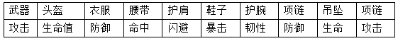 装备有10个部位,分别为:武器、头盔、衣服、腰带、护肩、鞋子、护腕、项链、吊坠、戒指。其中武器分职业,角色只能穿戴本职业的武器。