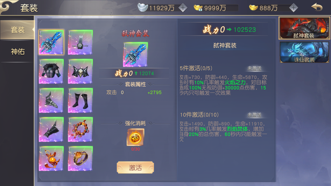 1)战神套装是独立的一套装备,为角色提供大量属性加成,并激活套装效果。通过主界面右下角战神套装按钮