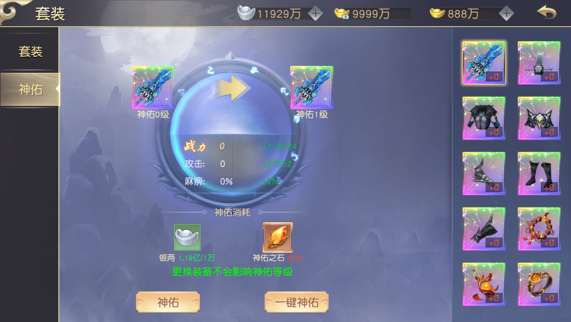 3)套装神佑:消耗神佑之石,可对套装进行神佑,除了极大增加套装的基础属性,还有高级百分比属性加成,包含麻痹和麻痹抗性。右侧选择想要神佑的部位,点击神佑即可,也可使用一键强化功能,将全身装备神佑。套装只能神佑一次。