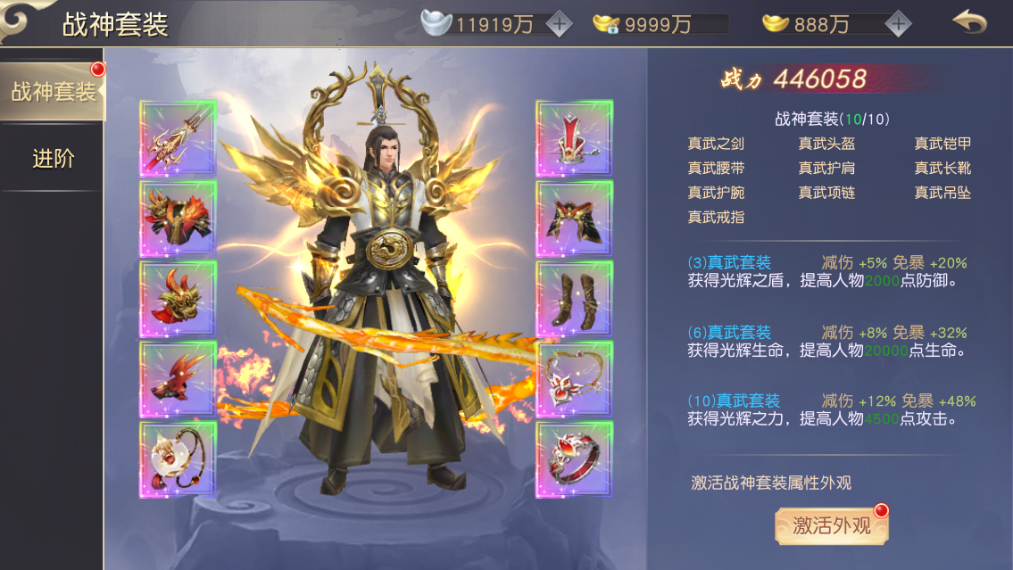 3)激活了战神套装后,还能通过消耗同部位的战神装备来进阶,提高战神装备阶数。阶数提升后,能提供更高的属性加成和套装效果。