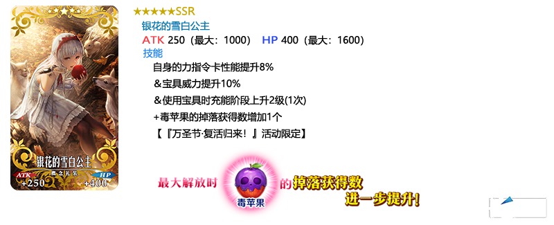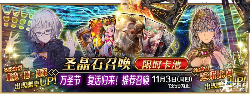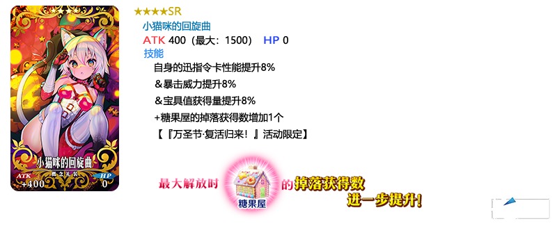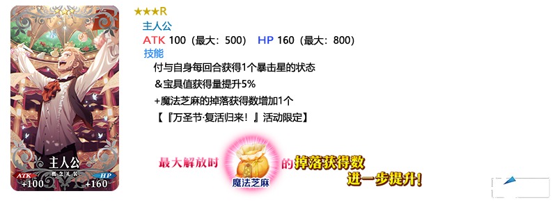 装备推荐召唤对象的3种限时概念礼装,在限时活动「万圣节・复活归来!~砂尘的女王与暗黑的使徒~」中活动道具的掉落获得数将提升!
