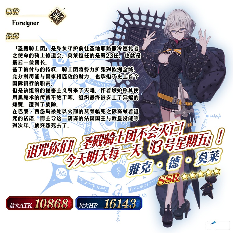 ※以上「★5(SSR)雅克·德·莫莱」的圣肖像为灵基再临第2阶段。