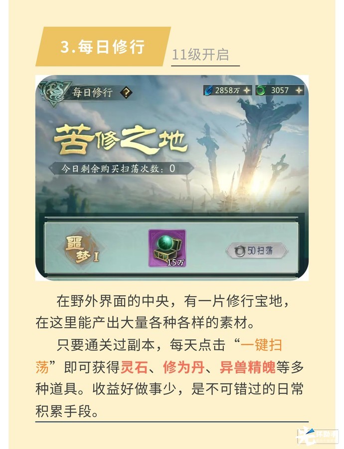 《山海经幻想录》干货满满-每日必做!伊辛贝露发布于 2022-11-22号外号外,3D国风山海经手游《山海经幻想录》现已上线删测!化身天命元灵,踏上这宏伟壮阔的山海之旅吧!在《山海经幻想录》的世界里,玩家将亲手孵化各种珍奇异兽,组建自己的专属队伍。更能一步步培育成长,不断击败袭来的敌方异兽,称霸蛮荒大陆!不难看出,养成是其关键。本期攻略就为大家带来《干货满满,每日必做》!《山海经幻想录》现已开启删测,快来山海世界一探究竟吧!
