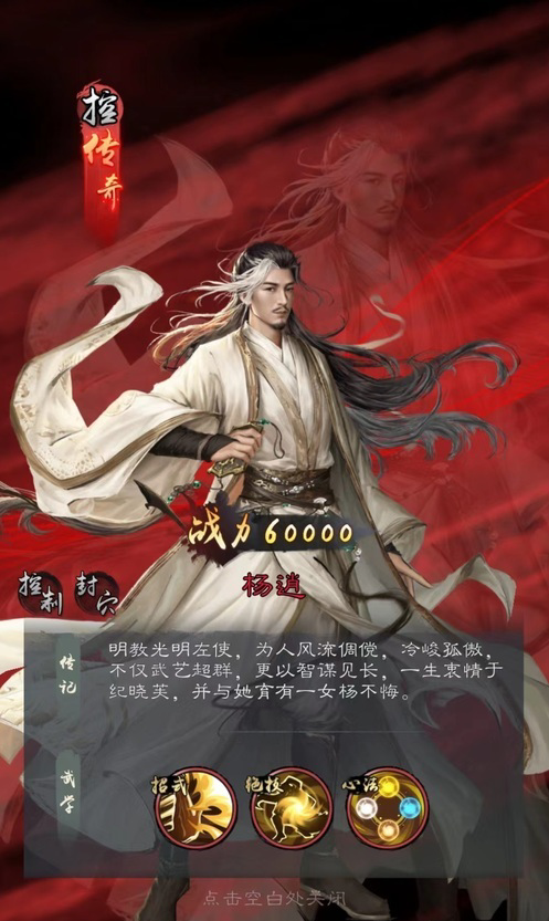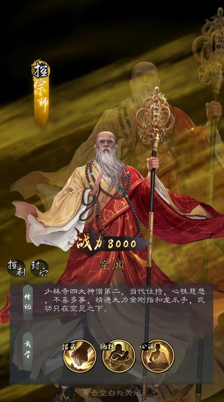 空闻大师属于宗师级角色,作为少林四大神僧之一同样擅长封穴。自身技能大力金刚指选择对方一列做为输出目标,同时有几率封穴。相比于杨逍,空闻技能作用目标要少很多,但是几率要高一些。并且在心法洗髓经帮助下,普攻技能也有几率为目标封穴,所以综合下来并不比杨逍差多少。