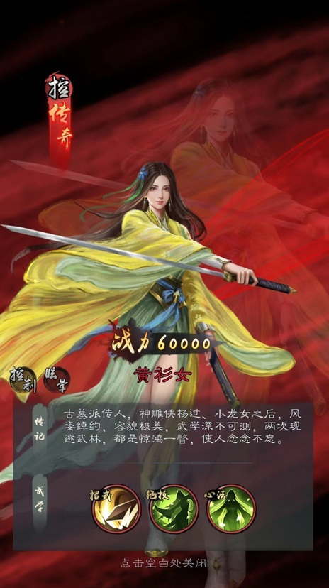 黄衫女同样是传奇级别的角色,自身绝技玉女素心剑法伤害敌方全体,并且有几率使目标眩晕两个回合。这个技能的伤害和杨逍不相上下,但是眩晕几率要比封穴几率低一些。好在被眩晕目标无法进行任何行动,所以是效果最好的控制技能,再加上心法玉女心经影响,可以在开场就能随机眩晕对方一名角色。运气好了直接将对方输出控制住,就能带来极大的优势,比较看运气。