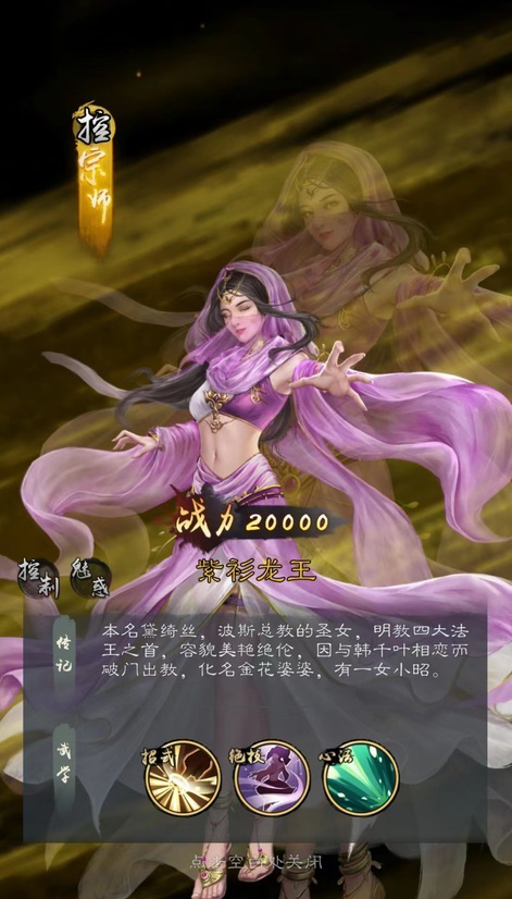紫衫龙王是波斯明教圣女,自身技能紫电穿云能够伤害对方前排,并且有几率使其陷入混乱状态,被混乱的目标不分敌我进行攻击,也是一个很好用的状态技能。在心法寒潮之气加持下,在战斗前三个回合降低对方受到治疗效果,对抗一些以续航流为主要玩法的流派非常有用。