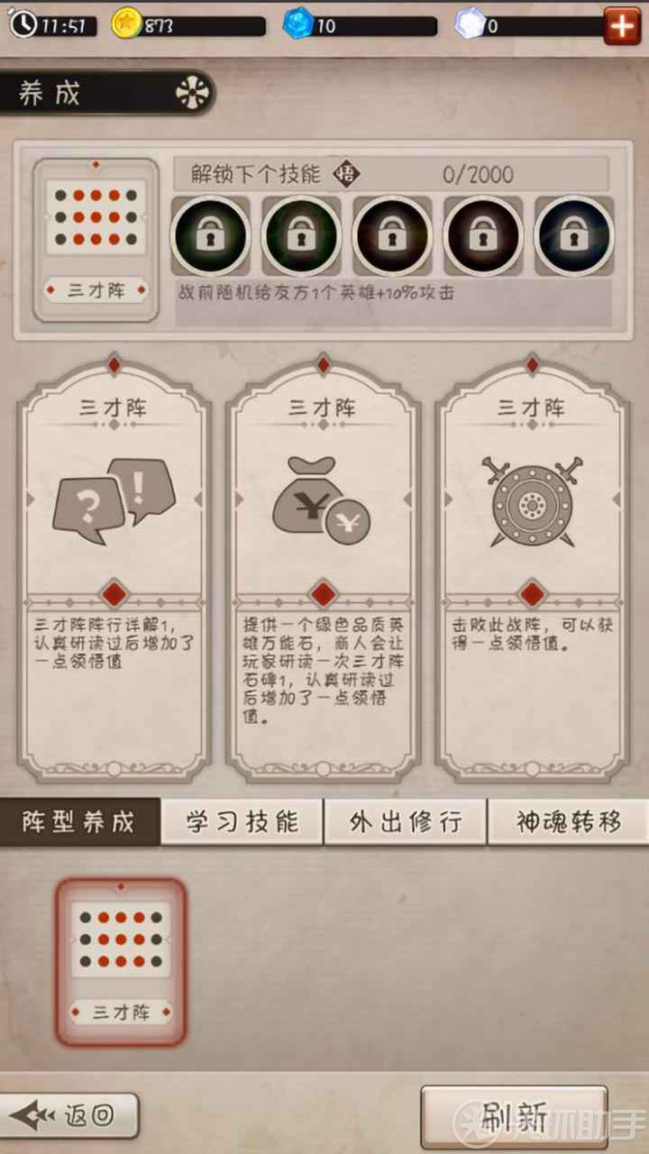 阵型:总共有十个不同的阵型,每一个阵型都有不同的战斗加成。需要玩家去选择合适自己英雄的阵型使用。阵型技能需要提升阵型的领悟值。