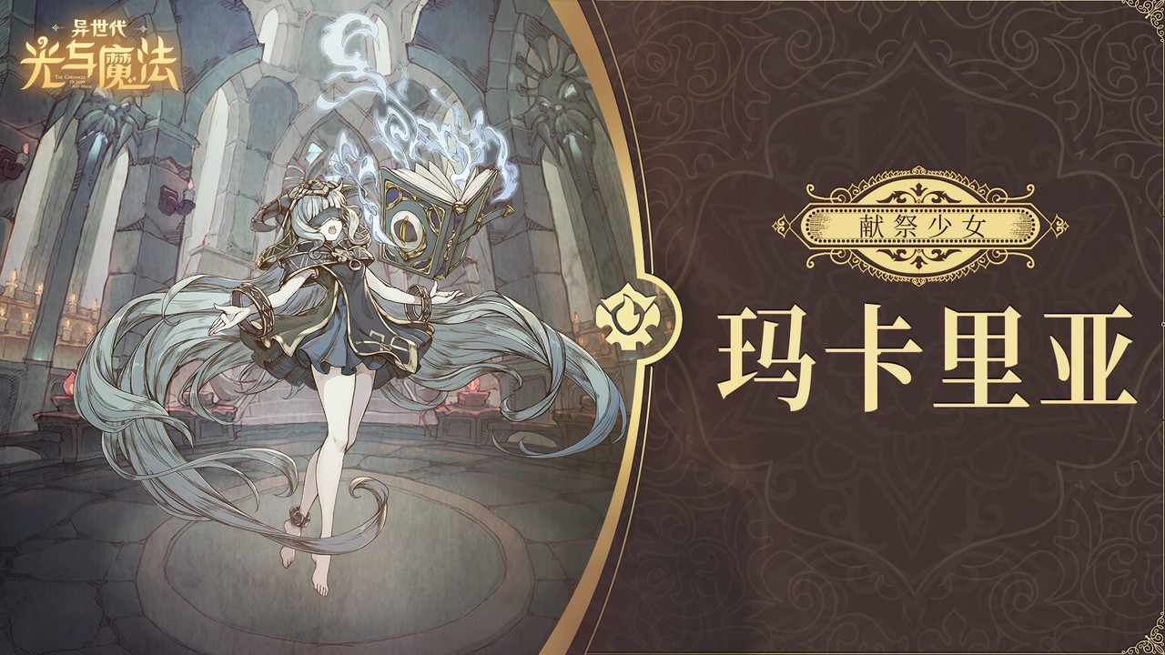 「献祭少女·玛卡里亚」是一名与恶魔之书融为一体的献祭少女,她的武器就是手中的恶魔之书。她最喜欢跟母亲一起弹钢琴和读书,讨厌自私自利的父亲。因为一直活在被父亲亲手献祭给恶魔的阴影之下,所以比较抑郁寡欢。