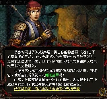 《破晓九天》神威狱玩法说明伊辛贝露发布于 2022-11-15开放时间:限时开放玩法介绍:神威狱通过魔法阵祭祀(中州429,170)进入,共五层,每完成一层还可以获得大奖。在神威狱中镇压心魔可以获得大量奖励,使用特殊道具“镇魔符”还可以控制强大的心魔为你战斗。