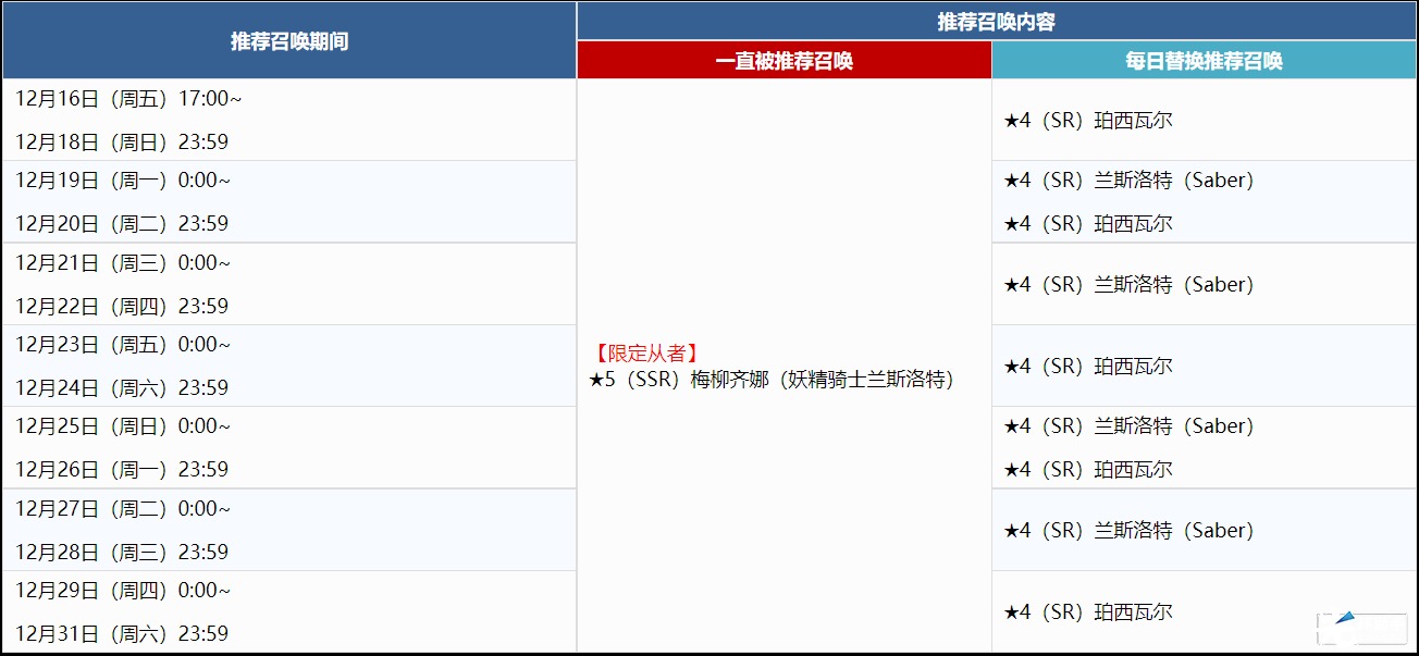 ※每日的推荐召唤从者不同,敬请注意。