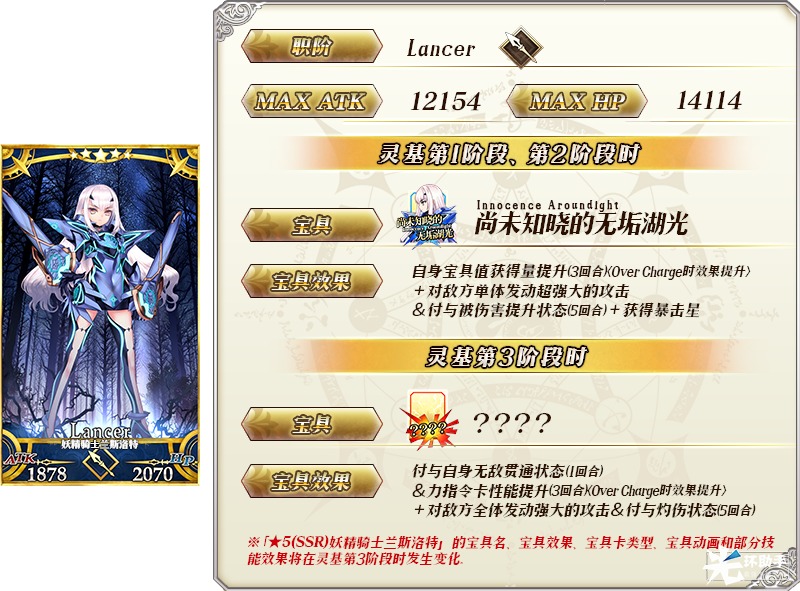 ※当「★5(SSR)妖精骑士兰斯洛特」处于灵基再临第1阶段或第2阶段时,在战斗中使用特定技能后将变化为灵基再临第3阶段,相应的一部分技能和宝具效果也将产生变化。此外,因技能效果变化为灵基再临第3阶段后,在此次战斗中无法使用同一技能变回第1·第2阶段。
