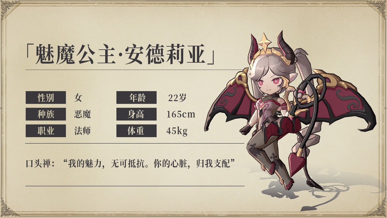 「魅魔公主·安德莉亚」是天生具有魅惑人心的魔女。她手持长鞭,喜欢让别人臣服于自己的魅力,成为自己的奴仆,以玩弄别人的感情为乐。她无法忍受别人对她的无视,简而言之,她就是一个狡猾,诡计多端的魔女。伴随着一阵异样的微光,一个婀娜多姿的身影出现在空中,一双宽大的恶魔之翼从她背后伸展开,可以看到关节上缀着尖刀似的利爪,还有一条结着尖刺的修长恶魔尾在来回摇摆着。弯曲的双角下,是一张绝美的少女面孔,少女唇边带着一丝戏谑的微笑,闲适地把玩着她的鞭子,以高傲的姿态睥睨众生,这就是来自深渊的魅魔——安德莉亚。在所有魔族生物中,魅魔看起来是最迷人娇弱的一个种族,但其实她们才是最危险致命的。尤其是能力最为出众的安德莉亚,她生来就具有魅惑人心的魔力,她的魔力可以轻而易举地抹去他人的自主意识,令人无法抗拒地臣服于她,成为她永久的奴隶。然而,毫无难度的征服并不能给安德莉亚带来多大的满足感。恶魔本性的她逐渐展露出残暴的一面,对于轻易俘虏者,她从不施舍怜悯,总是无情地用鞭子随意虐打,毫不理睬他们的可怜哀求,甚至十分享受这种施虐带来的快感。对于难以征服者,她更是视为对自己的极大侮辱,往往采取更加残忍的方式疯狂报复,从受害者心中探查他们深爱的人,然后利用心灵感应呈现出令人无法承受的毁灭景象,彻底摧毁受害者的精神。凭借这种能力,安德莉亚本可以将大量的凡人怨魂引诱到深渊之中,赢得来自撒旦和路西法的敬意;亦或是在战斗中发挥她的恐怖实力,成为魔族一大值得倚仗的势力。但任性和慵懒是魅魔的天性,安德莉亚对于这些只会给自己带来麻烦的事情毫无兴趣,她更喜欢随心所欲地活着,利用美貌或魔力来征服和玩弄这个世界。