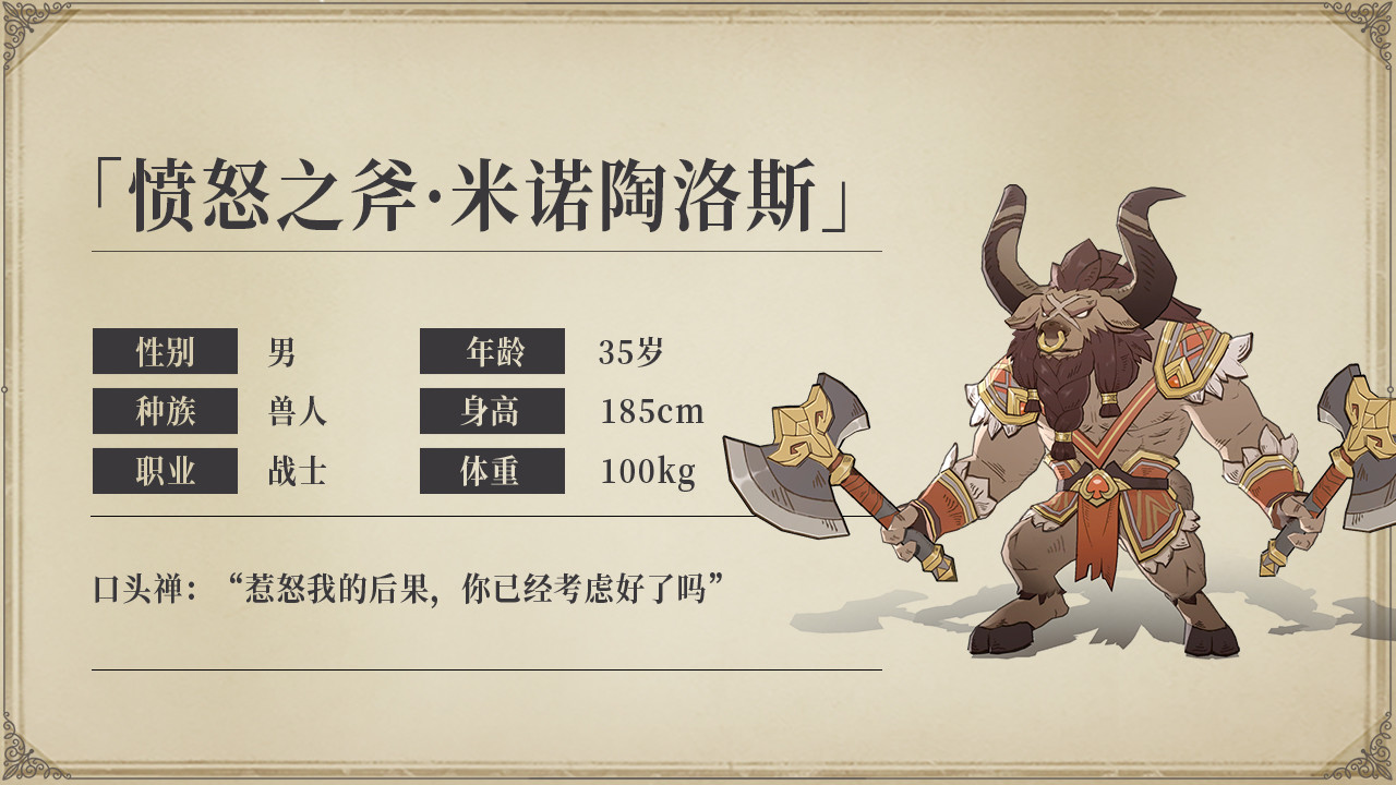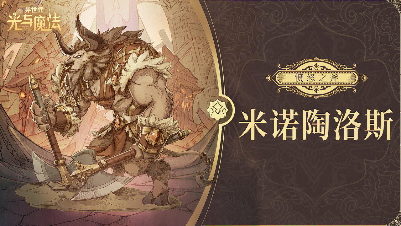 「愤怒之斧·米诺陶洛斯」是一名品格高尚的牛头人战士,富有荣誉感。他手持双斧,向往和平和荣誉,讨厌不正义的掠夺和侵略,以及卑鄙的行径。他虽然看起来面目凶狠,但也有不为人知温柔的一面。 从寂寂无名到集无数荣耀于一身的战神,米诺斯用手中的战斧,从惨败中杀出一条血路并成功复仇,他的勇猛传遍了整个兽人部落,成为了一代传奇。 无人知道,这一路走来,米诺斯历经了多少艰辛磨难。 米诺斯原本有着一个无忧无虑的童年,他们是一群游牧在旷野平原的庞大族群,爱好和平而又富有荣誉感。虽然牛头人看起来体型巨大,充满野性,被人类视为邪恶的生物。然而事实上他们却是信奉大地和图腾文化的族群,致力于维护草原植物和不朽的元素精灵之间的平衡,与周围的生灵物种保持友好相处的关系。 但牛头人的生活也并非一派安定祥和的景象,因为他们的天敌——同样身强力壮且在速度上更占优势的半人马族时刻虎视眈眈着。 在漫长的岁月中,半人马族不断地对牛头人进行侵扰和掠夺,而本性温和的牛头人却只会一味地退避忍让。直到米诺斯的父亲雷恩,一位深受敬重的牛头人战士的出现,他接任酋长后,便迅速带领族人组建一支牛头人卫战队,一次又一次地击溃半人马族的进攻。 一连取得几场胜利后,雷恩身边有一位名为基尔的心腹一直鼓动他乘胜追击,一举夺回以往被人马族侵占的领地,这个想法获得了一半族人的支持,同时也遭到了另一半族人的反对,决定权最后落在了雷恩手中。 就在雷恩犹豫不决时,基尔突然传来了米诺斯被半人马族俘虏的消息。这一消息扰乱了雷恩的心绪,救子心切的他根据基尔的情报立刻带军前去营救,不料途径峡谷时,巨大岩石突然从两侧翻滚下来,雷恩和他的部下避闪不及,瞬间被岩崩所掩埋。 而最早报信的基尔此刻正挟持着米诺斯在山顶目睹这一幕。 这一切都是基尔的阴谋。原本他比雷恩更具资格可以继任酋长,却在一次战役中为救雷恩而被敌人斩断一臂,之后彻底与酋长之位无缘。但那次战役后,雷恩却越战越勇,声望越来越高,最终成为了酋长。 命运的不公扭曲了基尔的内心,他将满腔不甘化成了对雷恩和牛头人族的仇恨,认为是他们抛弃了自己,于是设下这场处心积虑的阴谋。 之后,基尔想斩草除根,彻底解决米诺斯这个隐患,但他没预料到的是,顽强的米诺斯居然能死里逃生。
