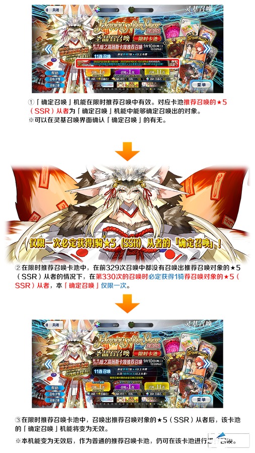 •在限时推荐召唤卡池中,在前329次召唤中都没有召唤出推荐召唤对象的★5(SSR)从者的情况下,在第330次的召唤时必定获得1骑推荐召唤对象的★5(SSR)从者,本「确定召唤」仅限一次。
