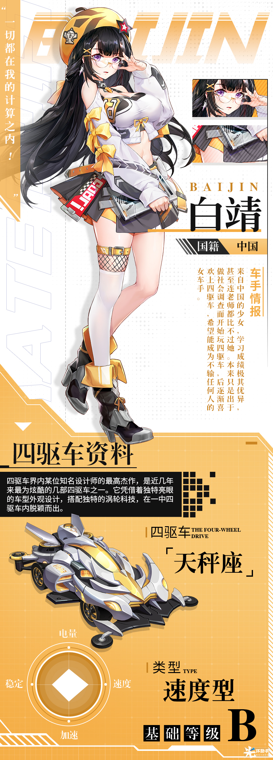 《终极漂移》车手情报公开——白靖伊辛贝露发布于 2022-09-27“一切都在我的计算之内!”「车手:白靖」来自中国的少女,学习成绩极其优异,甚至连老师都比不过她。本来只是出于做社会调查而开始玩四驱车,后逐渐喜欢上四驱车,希望能成为不输任何人的女车手。「四驱车:天秤座」>>四驱车界内某位知名设计师的最高杰作,是近几年来最为炫酷的几部四驱车之一。>>凭借着独特亮眼的车型外观设计,搭配独特的涡轮科技,在一中四驱车内脱颖而出。