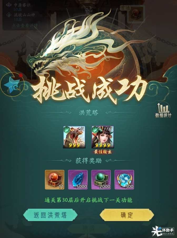 玩家从第一层开始依次挑战关卡,挑战成功即可获得该关卡对应奖励,并解锁下一层洪荒塔。
