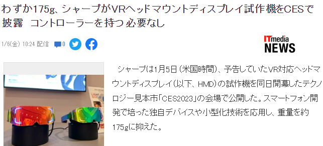 夏普公布新型头戴式显示器 轻量紧致长时间游玩不累白纸扇发布于 2023-01-06美国拉斯维加斯当地时间1月5日,世界最大家电IT大展CES 2023开幕,夏普则公开了旗下最新设计的头戴式显示器,支持电脑、手机以及VR等多种视频输入,轻量化紧致设计长时间游玩不累。 ·夏普新型头戴式显示器采用夏普公司最新显示屏技术打造,整个眼镜重量仅为175克,肢体镜片采用两片2KX120hz高级液晶屏,搭载高效RGB色彩系统,配合防晕眩设计,晚期VR、AR游戏得心应手。